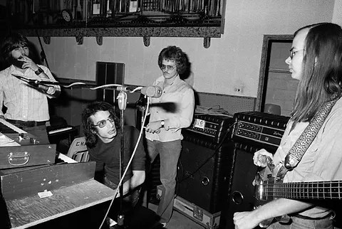 Michael McDonald, Donald Fagen, Tim Weston, and Walter Becker recording in studio